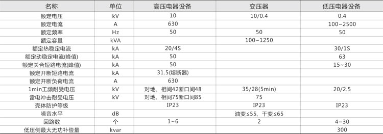 1. 本產品由高壓配電裝置、變壓器及低壓配電裝置聯接而成,分成三個功能隔室,即高壓室、變壓器室和低壓室,高、低壓室功能齊全,高壓側一次供電系統,可布置成環網供電、終端供電、雙電源供電等多種供電方式,還可裝設高壓計量元件,滿足高壓計量的需求。變壓器室可選擇S9、SC以及其他系列低損耗油浸式變壓器或干式變壓器;低壓室根據用戶要求可采用面板或柜裝式結構組成用戶所需供電方案,有動力配電、照明配電、無功功率補償、電能計量和電量測量等多種功能,滿足用戶的不同要求。并方便用戶的供電管理和提高供電質量。