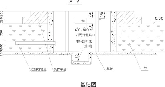 2. 基礎設在地勢較高處,四周向外排水,采用200#水泥沙漿砌筑,摻3%防水劑,底部向油槽略有傾斜(干變時取消油槽)
