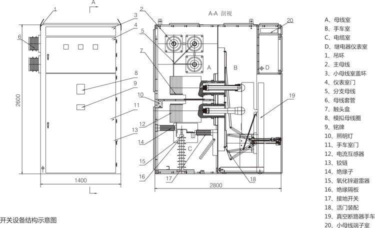 本開關設備具有電纜進出線、架空進出線、母線聯絡、隔離、電壓互感器、避雷器等主電路方案。母線采用復合絕緣,相間及連接頭配有用阻燃材料注塑而成的絕緣套,主母線相鄰柜間用母線套管隔開,能有效地防止事故蔓延,同時對主母線起到輔助支撐作用。電纜室裝有接地開關、過電壓保護裝置等。